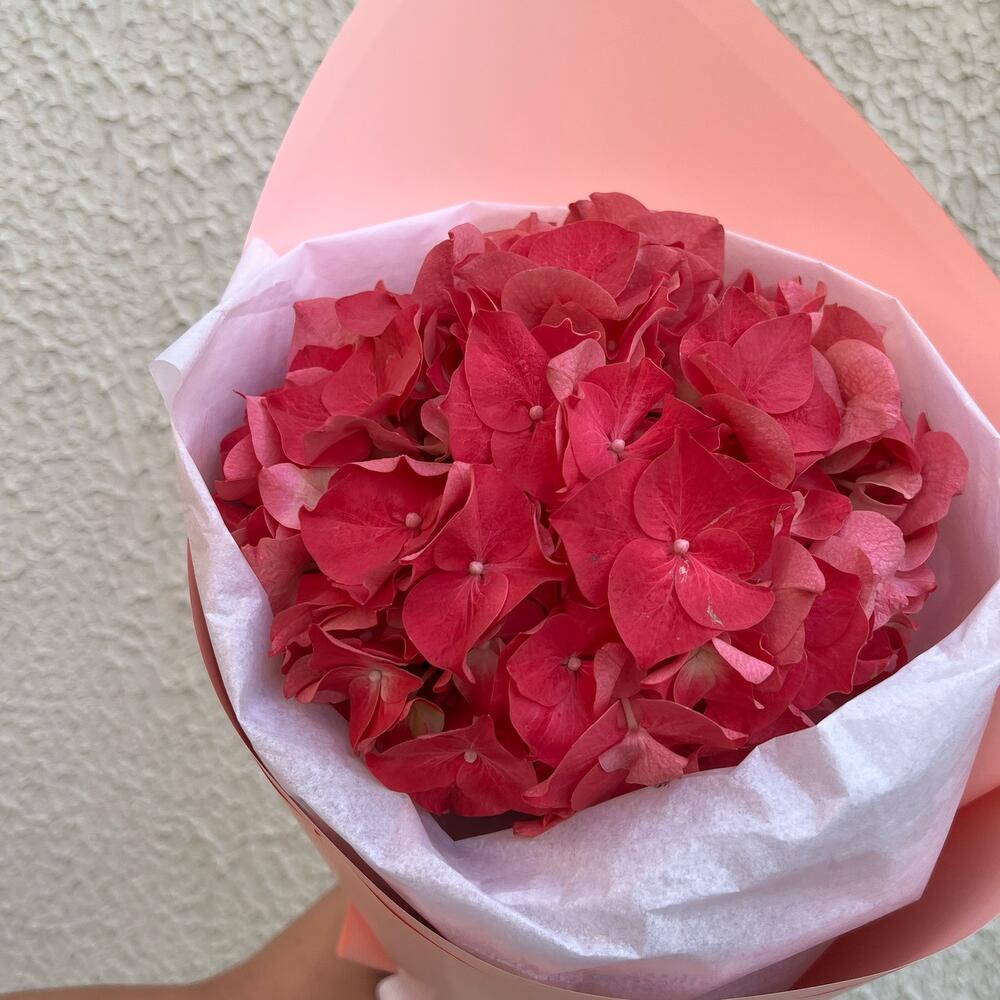 Лента атласная – 1 шт.Упаковка дизайнерская – 1 шт.Гортензия розовая – 1 шт.Упаковка тишью – 1 шт.подкормка для срезанных цветов – 1 шт.