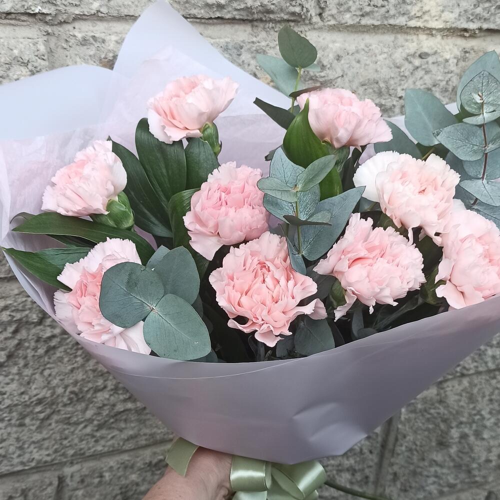 Рускус – 5 шт.Эвкалипт – 3 шт.Лента атласная – 1 шт.Диантус – 9 шт.Пленка матовая – 1 шт.Бумага тишью – 1 шт.