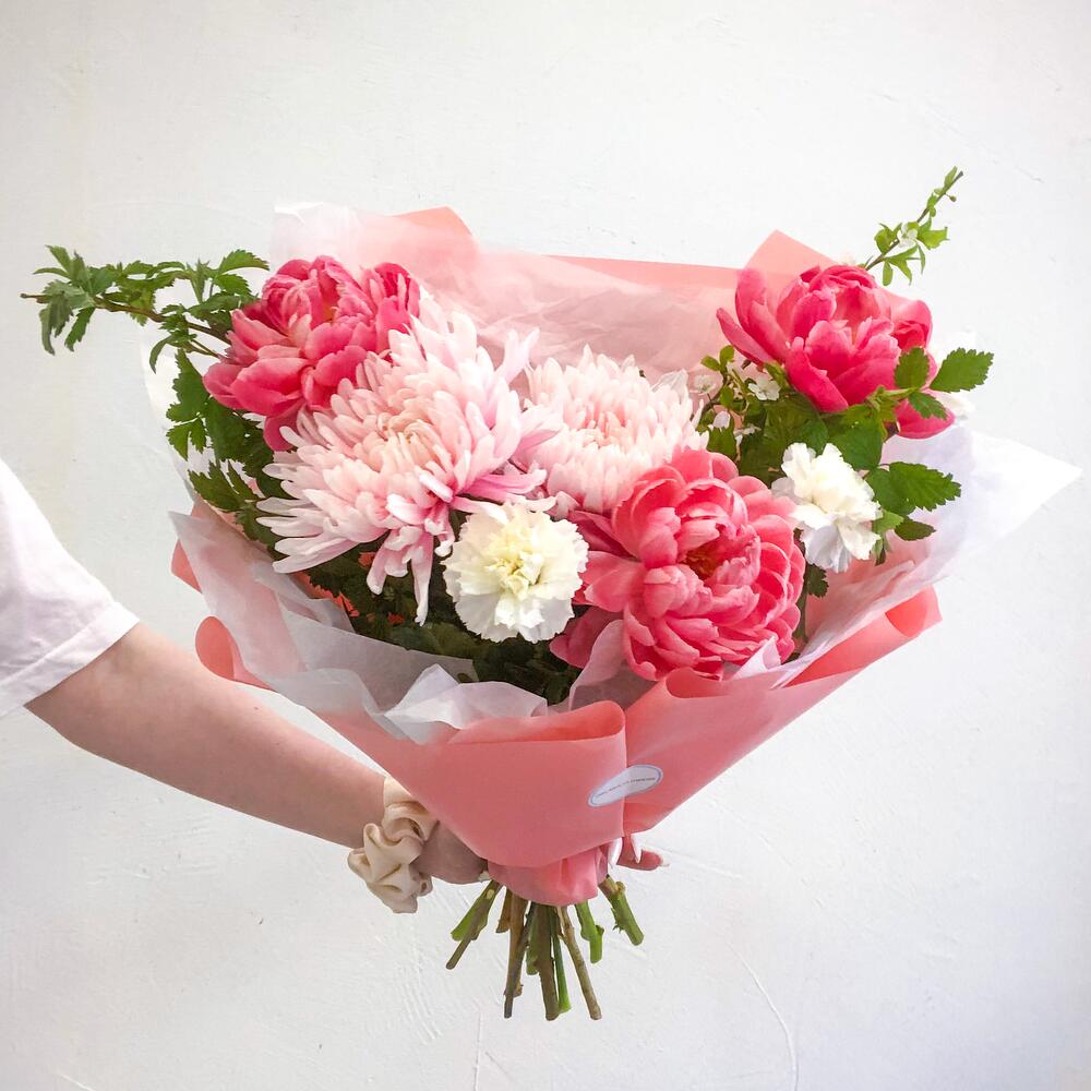 Букет с пионами и хризантемой в дизайнерском оформлении