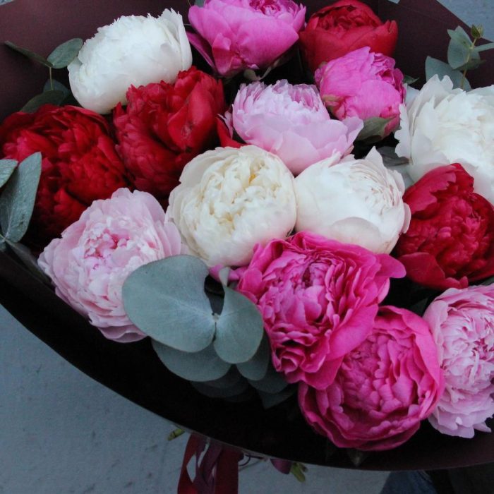 Пион – 15 шт.Эвкалипт – 7 шт.Упаковка – 3 шт.Лента атласная – 2 шт.