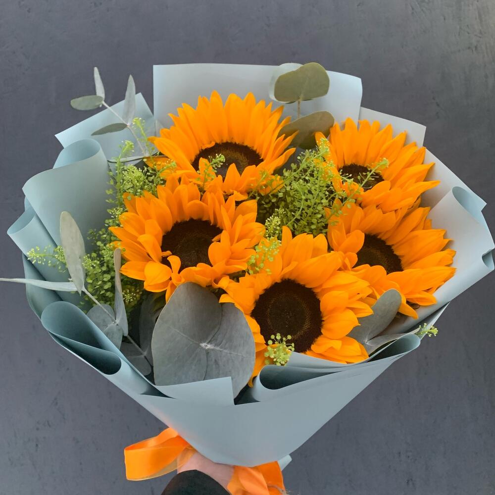 Букет из 9 подсолнухов в стильной упаковке "Прометей"