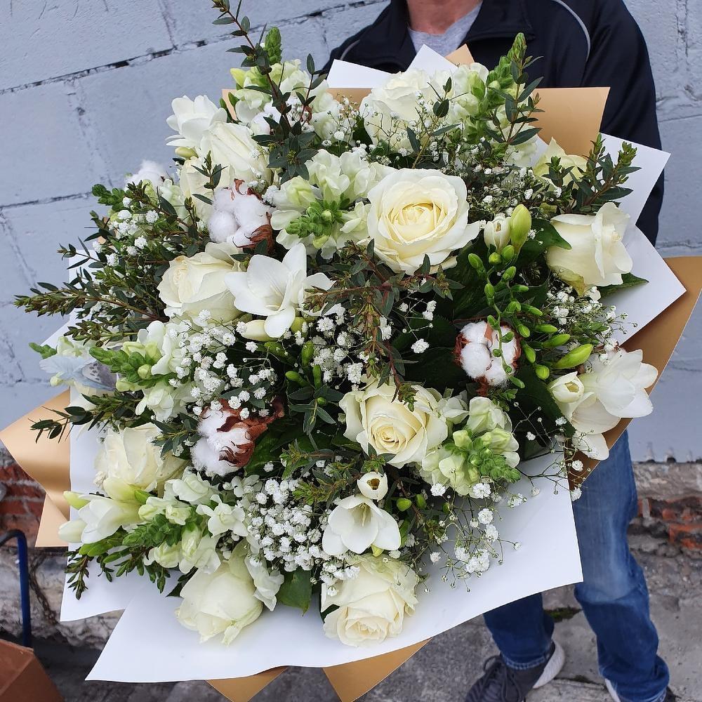 Гипсофила – 4 шт.Эвкалипт – 5 шт.Зелень – 25 шт.Роза белая – 19 шт.Фрезия белая – 10 шт.Упаковка дизайнерская – 5 шт.Львиный зев – 10 шт.Птичка декоративная – 1 шт.Хлопок натуральный – 5 шт.