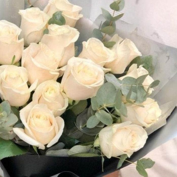 Роза – 15 шт.Упаковка дизайнерская – 3 шт.Лента атласная – 2 шт.зелень декоративная – 2 шт.