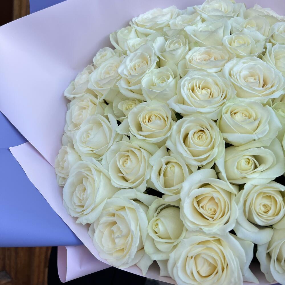 Роза белая 60 см – 65 шт.Дизайнерская упаковка – 5 шт.Тишью – 1 шт.Лента атласная – 2 шт.