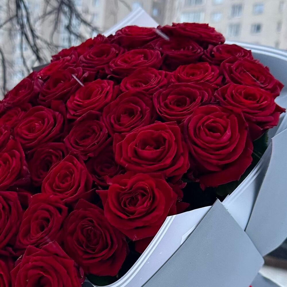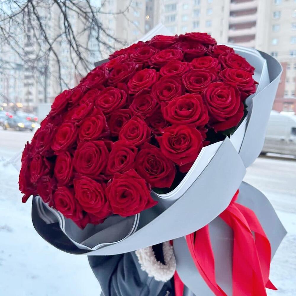 Роза красная – 71 шт.Лента атласная – 1 шт.Пленка дизайнерская – 2 шт.