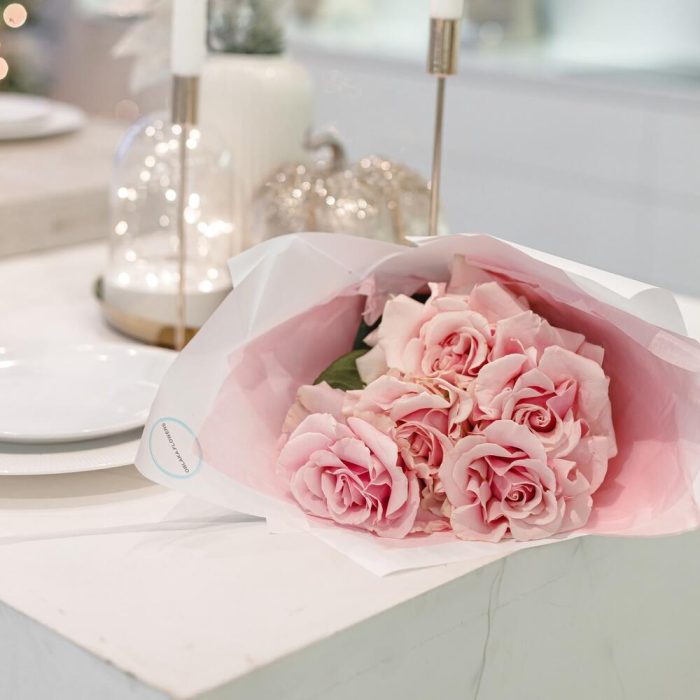 Роза французская – 5 шт.Тишью – 2 шт.Корейская пленка – 2 шт.Лента атласная – 1 шт.инструкция по уходу за цветами – 1 шт.Пакет крафтовый – 1 шт.