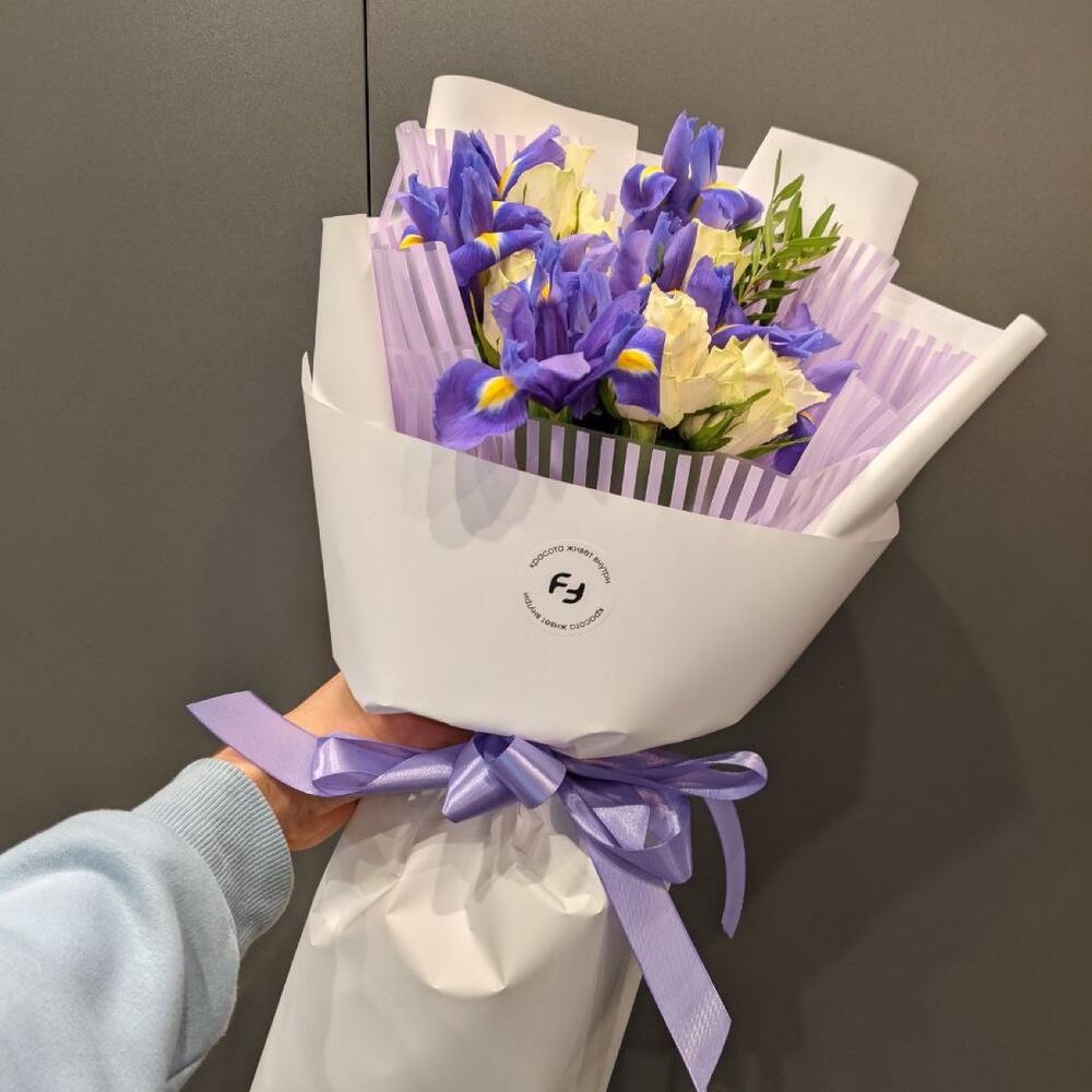 роза белая кения 40 см – 7 шт.Ирис синий – 8 шт.Упаковка дизайнерская – 2 шт.Лента атласная – 2 шт.