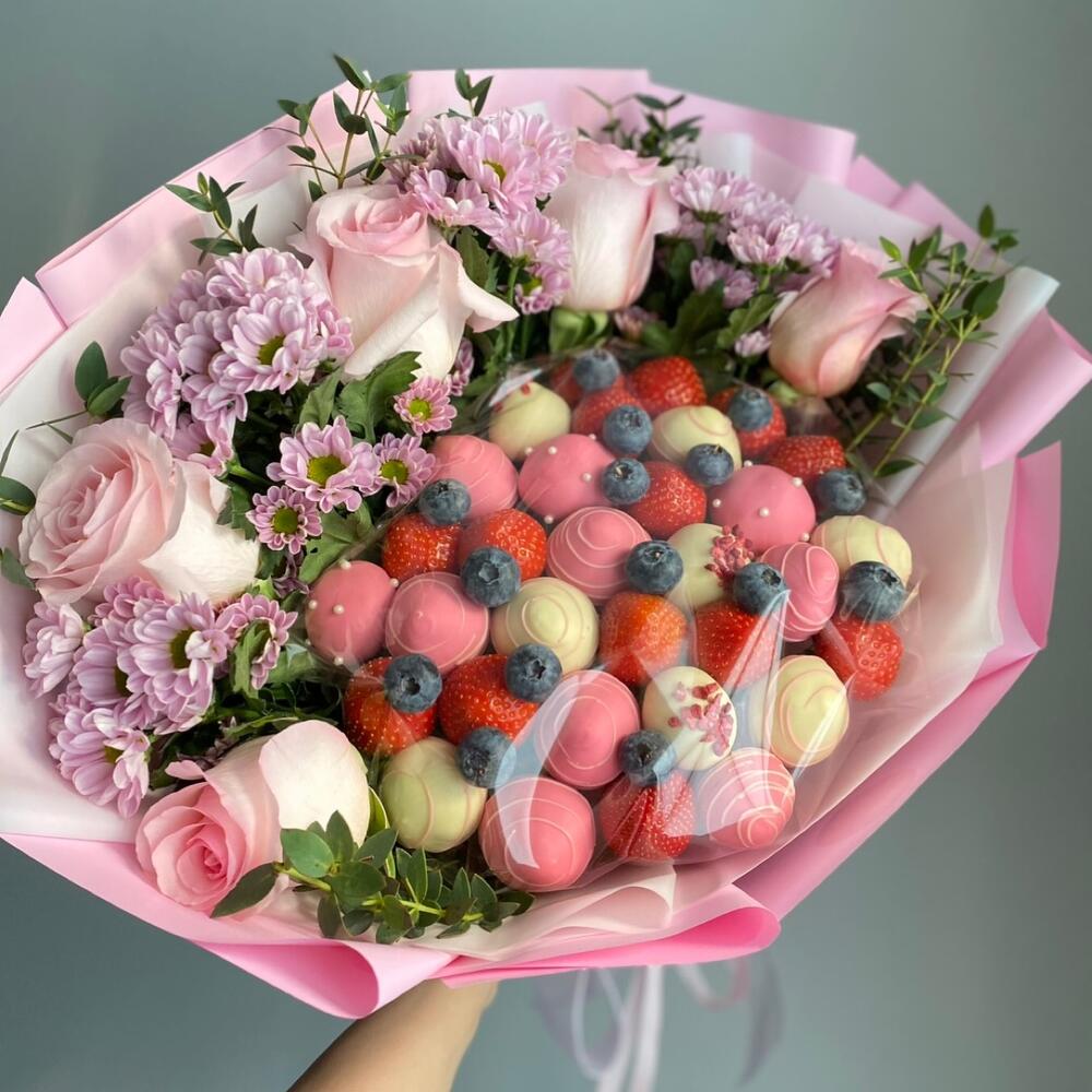 Клубника – 600 гр.Роза – 5 шт.Зелень – 3 шт.Сантини – 4 шт.Голубика – 15 шт.Бельгийский шоколад – 300 гр.