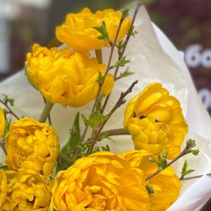 Тюльпан пионовидный – 9 шт.ветви цветущие – 9 шт.Упаковка дизайнерская – 5 шт.Лента органза – 1 шт.